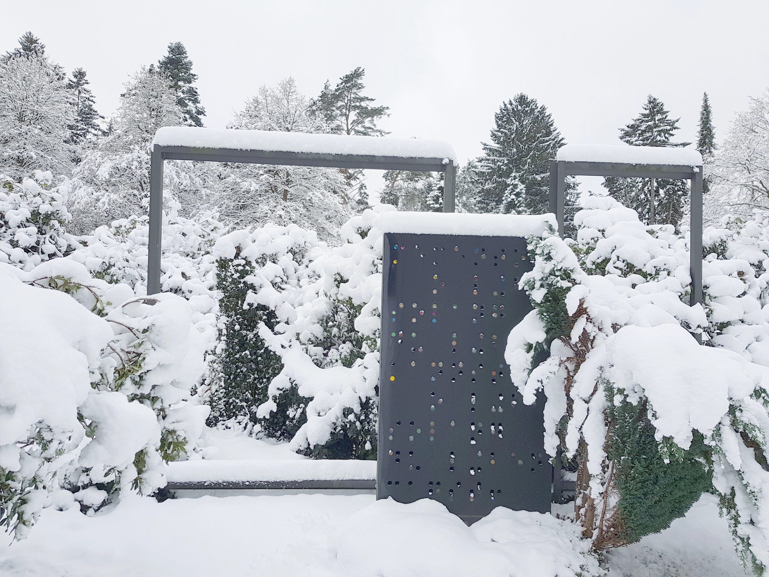 Der Entwurf zeigt zwei Rahmen als stilisierte „Wände“ mit einem davorstehenden Stein als „Tür“. Die imaginären Wände sollen hinter den Rahmen durch die dahinter wachsenden hohen Rhododendronbüsche ausgefüllt werden.